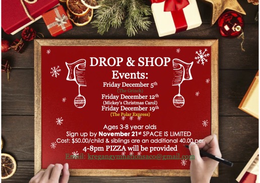 Gymnastics, Crafts, Pizza, and a Movie! Parents, enjoy some holiday shopping time while the kids have a blast!